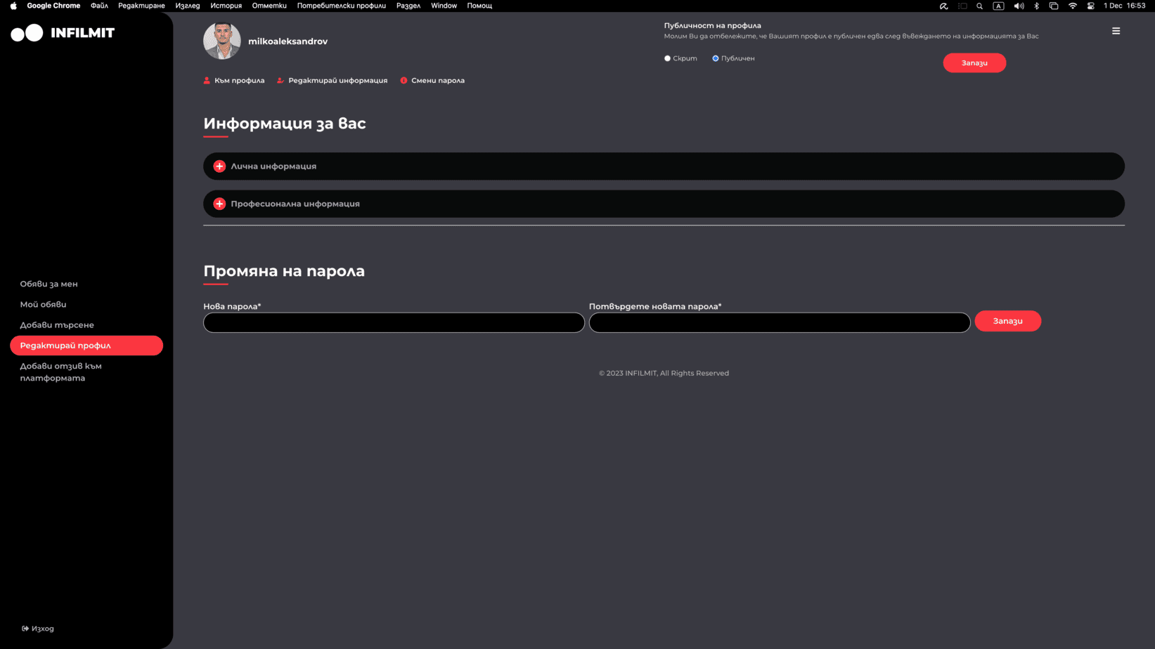В нашето портфолио е и INFILMIT – онлайн платформа за търсещите и предлагащите работа в сферата на филмовото и визуалното изкуство.