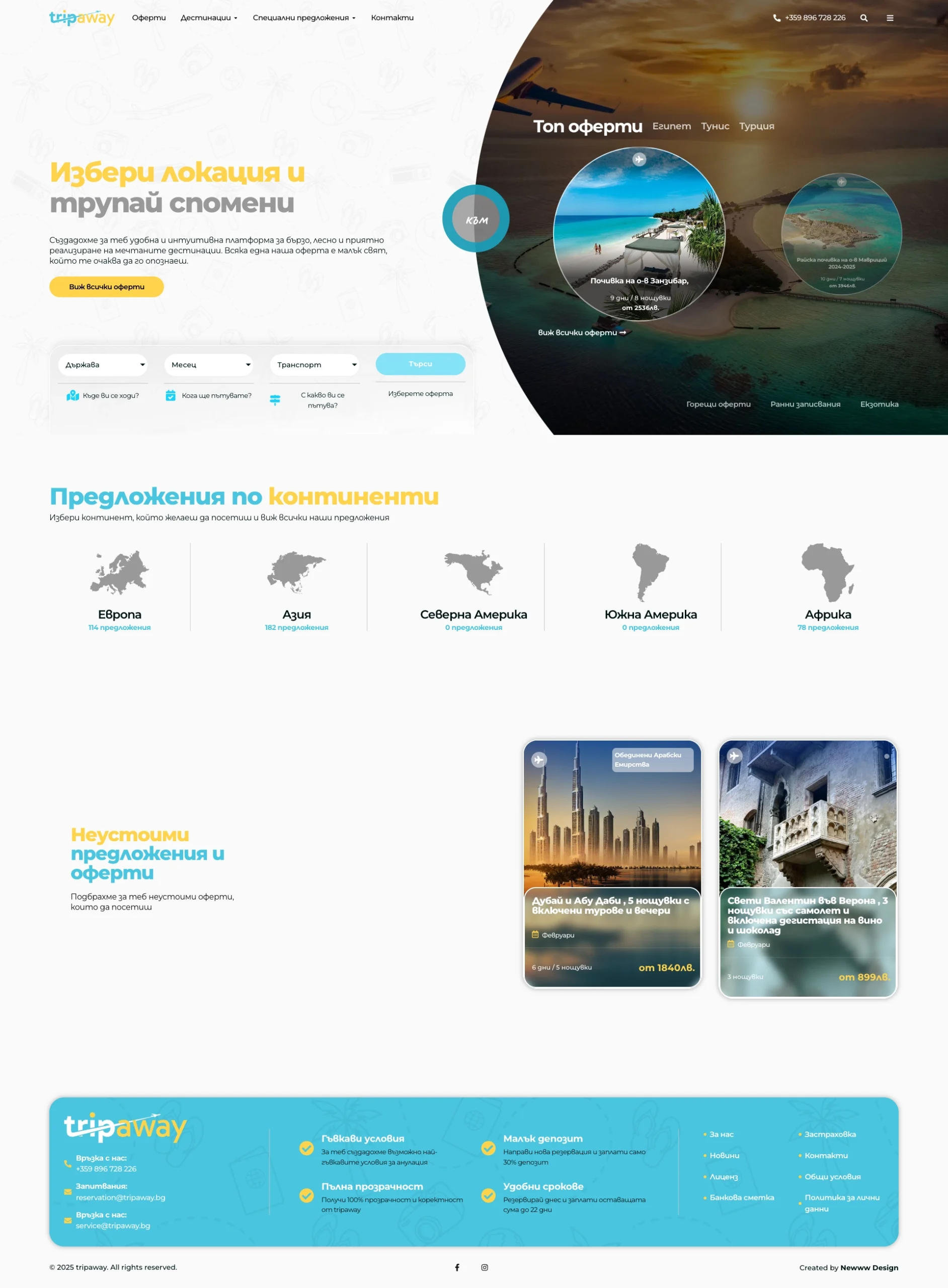 TripAway – втората туристическа перла в нашето портфолио. Разработихме цялостна система за автоматизирано интегриране на оферти, хотели и турове, както и изключително лесна и бърза търсачка за цени по избрана от клиента дата и брой туристи. Погрижихме се да създадем лек, модерен и изключително приятен уеб сайт, който оставя ярък отпечатък в съзнанието на стотиците клиенти на TripAway.